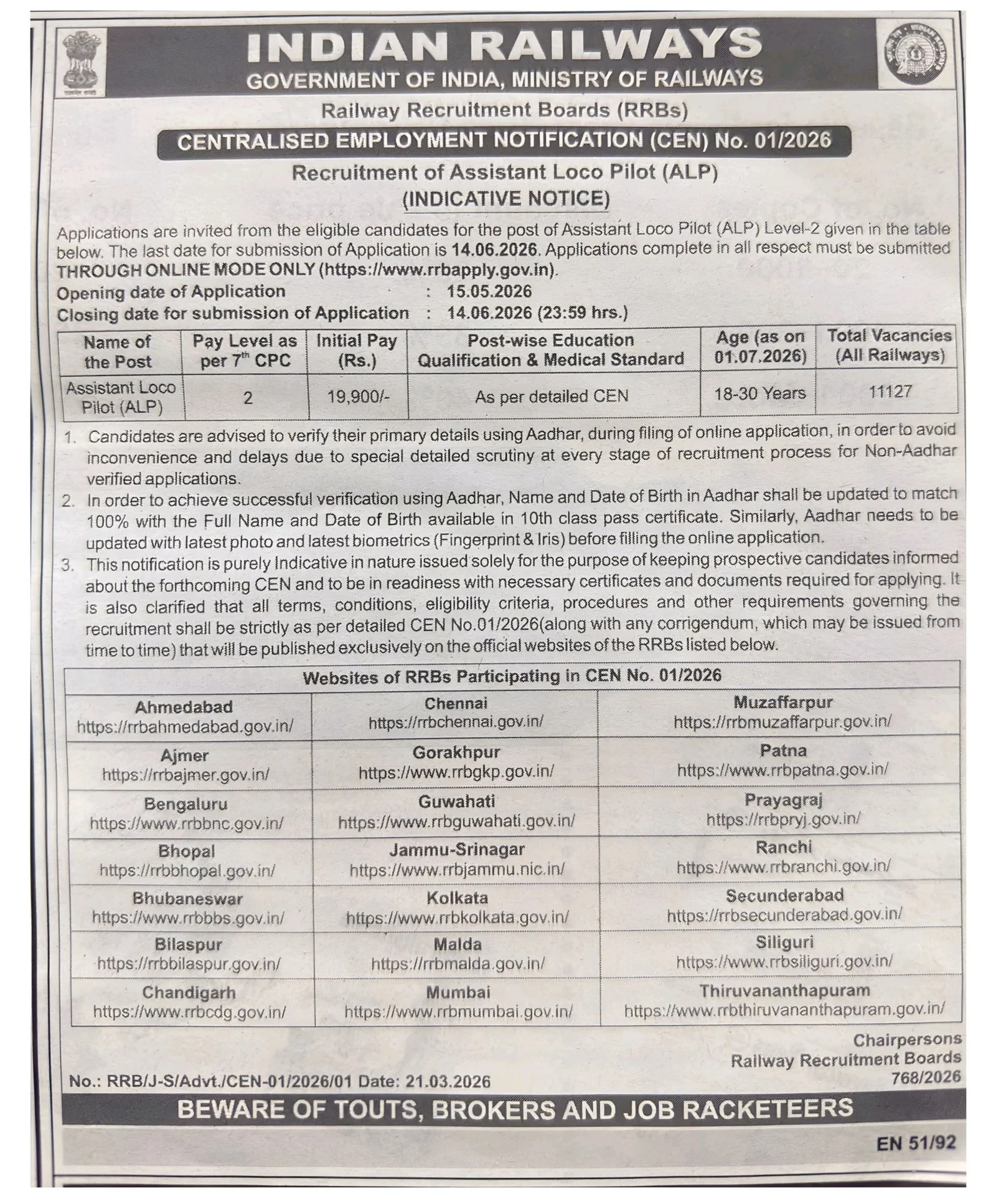 Railway ALP Bharti 2026 Online Form End14 June 2026