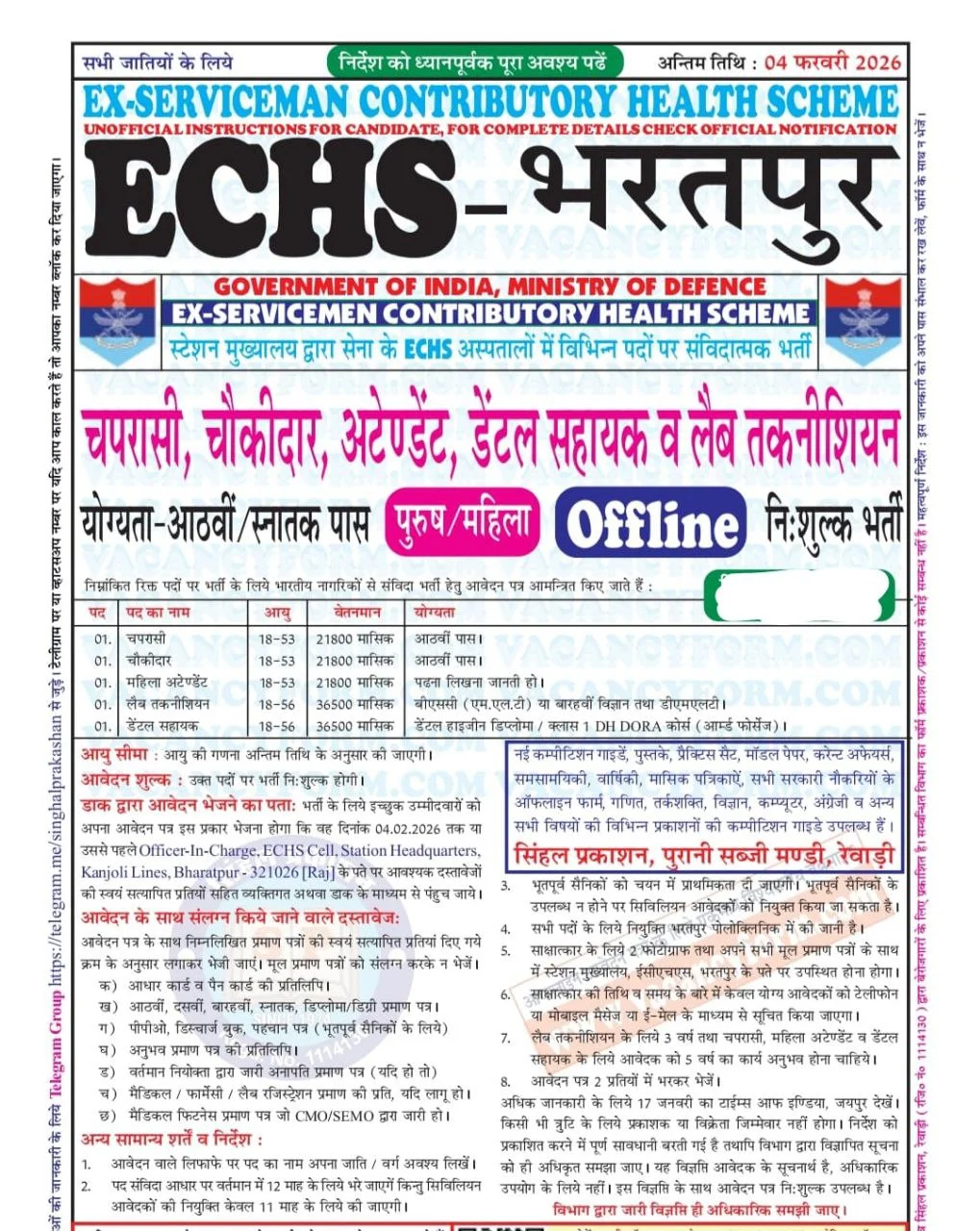 ECHS भर्ती राजस्थान के हनुमानगढ़, श्रीगंगानगर, भरतपुर और जोधपुर जिलों में निकाली गई है। इस भर्ती के लिए आवेदन करने की अंतिम तारीख 13 फरवरी 2026 तय की गई है। नोटिफिकेशन में आवेदन से जुड़ी सभी जरूरी बातें जैसे शैक्षणिक योग्यता, आयु सीमा, आवेदन शुल्क और आवेदन फॉर्म की पूरी जानकारी दी गई है। अभ्यर्थियों को सलाह दी जाती है कि वे इन सभी विवरणों को ध्यान से पढ़ लें और किसी भी गलती से बचते हुए तय समय से पहले अपना आवेदन फॉर्म भरकर जमा कर दें।
