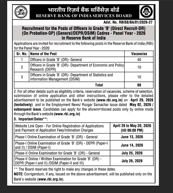 RBI Grade B Recruitment 2026: रिजर्व बैंक ऑफ़ इंडिया (RBI) ने Grade B भर्ती 2026 के लिए शॉर्ट नोटिस जारी कर दिया है। इस भर्ती के तहत ऑफिसर ग्रेड ‘B’ (जनरल, DEPR और DSIM) पदों पर कुल 60 पद भरे जाएंगे। इच्छुक उम्मीदवार 29 अप्रैल 2026 से ऑनलाइन आवेदन कर सकेंगे, जबकि आवेदन करने की अंतिम तिथि 20 मई 2026 शाम 6 बजे तक तय की गई है।